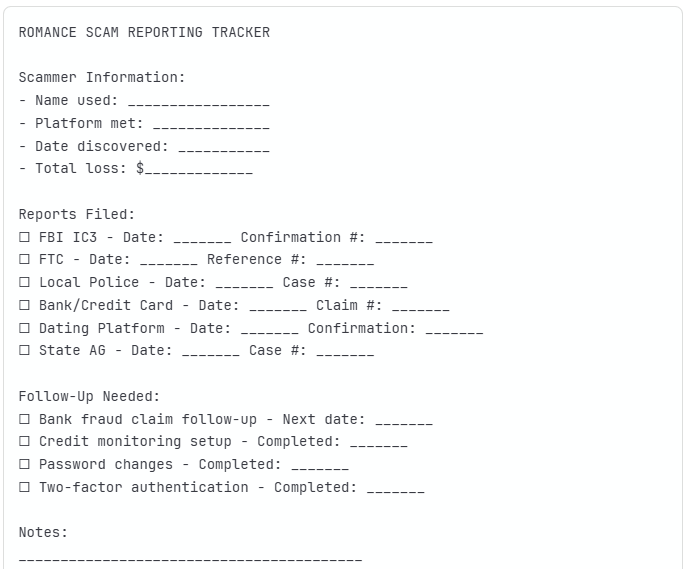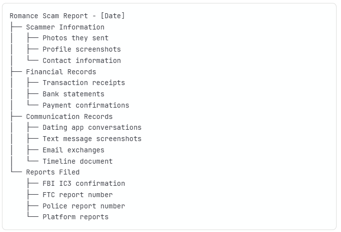 Romance scammers rarely work alone. Many are part of organized crime networks operating across multiple countries. When you report a romance scammer to the FBI or FTC, your report becomes part of a larger database that helps law enforcement: