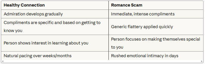 Scammers compress what should be a long journey into a short sprint. They accelerate emotional intimacy artificially. They create a sense of urgency and exclusivity that prevents you from thinking clearly or checking in with anyone else.